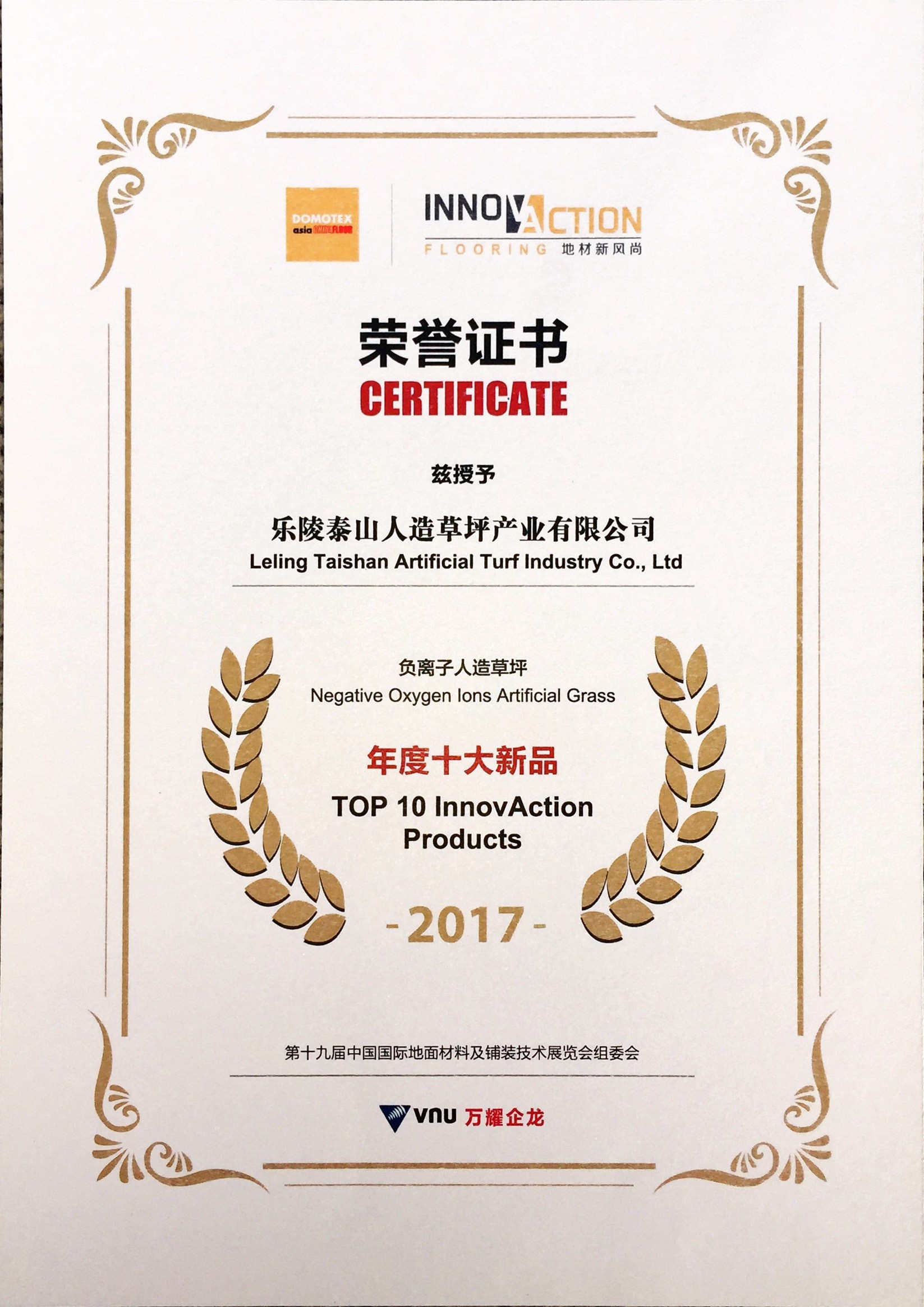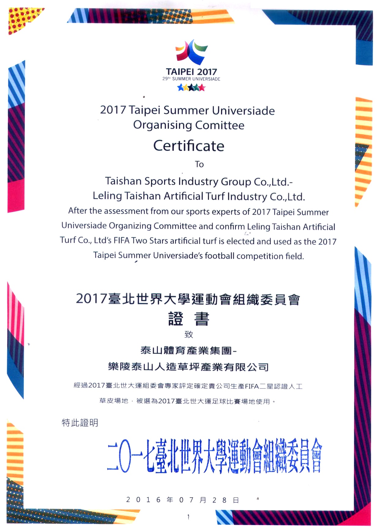 2017台北世界大学运动会组织委员会证书致乐陵球盟会人造草坪产业有限公司